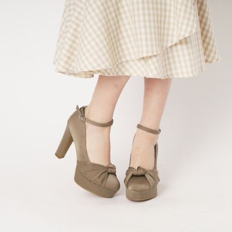 アッパーに被せた生地を結び目でリボンのように仕上げたハイヒールのパンプス。