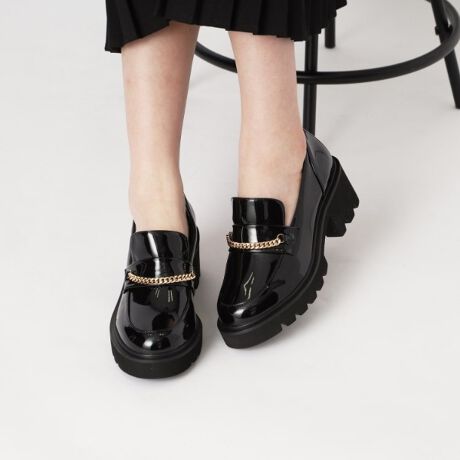 ゴツめのローファーにチェーンの飾りと取り外しのできるパール調の飾りをつけた欲張りな1足。