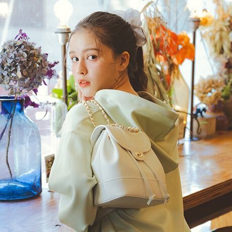 持ち手とショルダーストラップにチェーンをあしらったフラップミニリュックです。