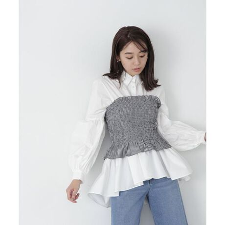 単品でも着回しが効く、ペプラムブラウスとシャリーリングビスチェの2点セットでレイヤードスタイルが決まる、今年らしいアイテムです。インナーのブラウスはオーバーサイズながらも、ギャザーペプラムデザインが女性らしい印象。ビスチェは全面シャーリングゴムでフィット感がありつつ、ストレスフリーな着心地です。<素材>フラットなシャツ素材を使用。<詳細>仕様・前ボタン裏地・なし透け感・なし / 光沢・なし / 伸縮性・なし 生地の厚さ・普通※モデルの着用画像の場合、光の当たり具合により、実際の色味と異なって見えることがございます。色味は、商品単体の画像をご参照ください。