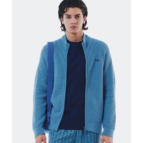 凹凸のあるバスケット編みが一着でニュアンスのある着こなしを叶えるジップアップニットセーター。