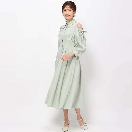 ショルダー部分のカットアウトがさりげない抜け感を演出するワンピース。サイドにリボンをあしらうことで、ガーリーな印象を高めています。ウエストにかけて寄せられたタックがスタイルアップ効果を実現。季節の変わり目のお出かけシーンにぴったりです。
