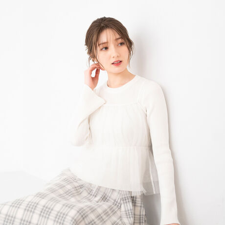 透け感のあるチュールキャミとニットが組み合わされたアイテム。キャミソールのバックにはリボンを施し、可愛らしさをプラスしています。リブ生地で仕立てられたニットは、フィット感のある着心地に。セットはもちろん、単品でも活躍してくれます。