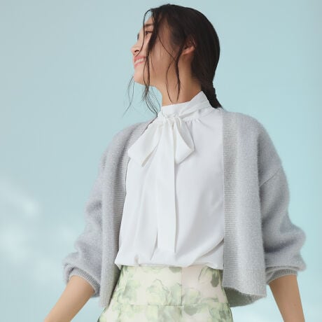 きらきらとしたフィルムヤーンが華やかな印象を与えるカーディガン。ボタンレスになっており、さっと気軽に羽織ることができます。短めの丈感で、ウエスト位置を高く見せてくれるのもポイント。ワンピースにプラスしたフェミニンな着こなしがおすすめです。