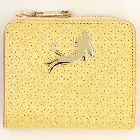 まるで花のような型押しの革の上にネコがダンスしているような金具を使用したお財布です。