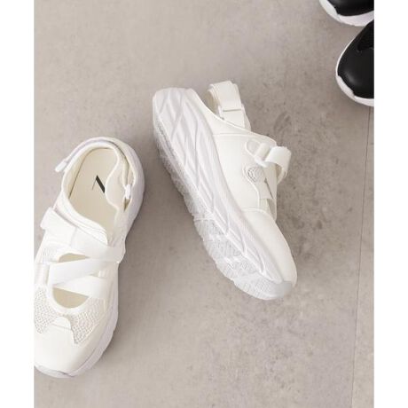 部分的にメッシュを取り入れた春夏らしいスニーカーは、かかと部分が開いているため、スポーツサンダルとスニーカーの中間的なデザインが特徴。バックベルトで足元をしっかりホールドできる仕様なので、はき心地も良いです。程よくボリュームがあり、スポーティな印象ながらも、ワントーンで仕上げているので、大人っぽくデイリーのスタイリングに合わせていただけます。