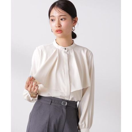 落ち感のある上品とろみ素材で仕立てたブラウスは、大胆なケープデザインがアクセント。前後で切り替えを入れているので、ボトムインしていただくとケープが映えてバランス良く決まります。襟元はバンドカラーでシンプルにまとめ、オフィススタイルでもきちんとした印象に。洗練されたベーシックパンツ、フェミニンな綺麗めスカート、デニムパンツとも着まわしできるので、幅広いスタイリングが楽しめます。