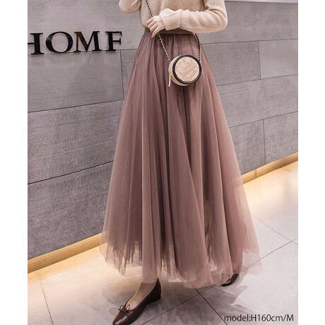 ふんわり揺れるボリュームたっぷりのチュールが主役級の、オールシーズン着まわせるロングスカート