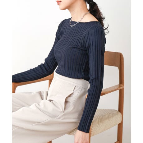 2種類の糸を表面と裏面に編み分けるプレーティングという技法を用いたリブニットプルオーバーです。襟元のボートネックが大人の女性のデコルテをスッキリと見せてくれます。リブ編みにしている為、テンションもあり良く伸びるので着心地も良いです。何にでも合わせやすいライトベージュとネイビーに加え、シックで明るさのあるブルーをオススメカラーとしてチョイスしています。
