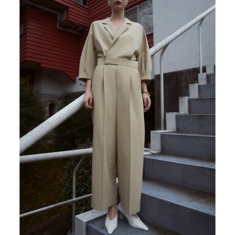 ブラウスと、スラックスのセットアップをスタイリングしたようなジャンプスーツ。テーラードラペルできちんと見えでかっこよく。ウエスト周りはタックが入っているので体型カバー効果も。忙しい朝もスタイリングを考えることなくかっこよくキマる、時短のきちんとつなぎ。ウエストベルト内側にアジャストタブがあるので、自分の好みのウエスト寸に調整が可能。