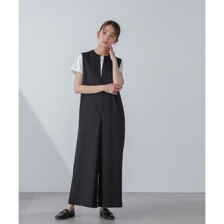 リラックスムード溢れる新作オールインワンがお目見え。縦長のシャープなキーネックが印象的で、腰周りからパンツにかけてやや太さのあるシルエットに仕上げました。サッと一枚で着用しても様になるオールインワンは、忙しい都会派女子には嬉しいアイテム。デコラティブなアクセサリーで華やかさをプラスすればオケージョンアイテムとしても使える万能な一着です。