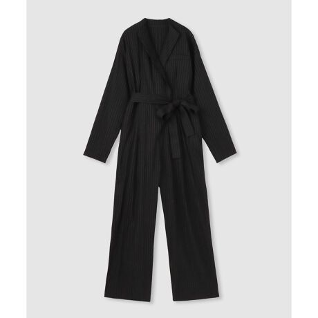 ストライプがマニッシュな雰囲気でジャケットライクなディテールを落とし込んだハンサムなジャンプスーツ。