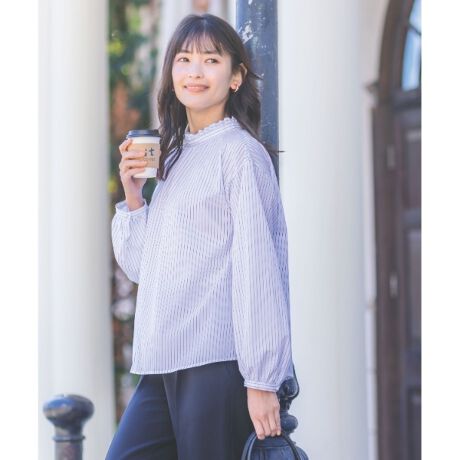 カジュアルにもきれいめにも着まわせる、爽やかなストライプ柄が春らしいハイネックブラウス。