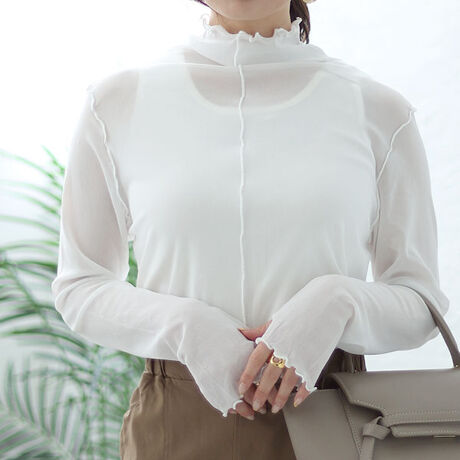 程よい透け感でレイヤードコーデを楽しめるシアートップスです。ぐーんと伸びるストレッチメッシュ生地で、優しいフィット感ですっきりと着れます。大人可愛く仕立てるメロウデザイン、センターライン入りで細見せもできちゃう優れもの。袖は長め&指穴付きでゆるっと可愛い袖を魅せることもできます。どんなファッションにも合う持っておきたいレイヤードアイテムです。