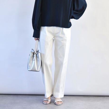 タックとセンタープレスで縦のラインが強調され、ゆとりはありつつもスッキリした印象に。