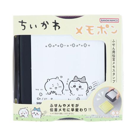 ”ちいかわ”デザインのふせん用伝言メモスタンプ「メモポン」です。お手持ちのふせんやメモに『ポン!』と押すだけで、ちいかわのキャラクターの入ったかわいい伝言メモに早変わり♪シャチハタ株式会社製の便利なスタンパーです。用途に応じて可愛く便利にご使用いただけます。