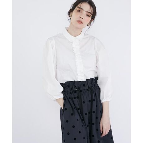 前立てに繊細で華奢な小さめフリルを2段取り付けた前開き仕様のブラウス。小ぶりな衿もきちんと感が増す大人可愛いシルエットです。肩と袖口にギャザーを入れたふんわり袖もポイントで、オンオフ問わずに着映えが叶います。オールシーズン使いやすい白と微光沢のシャンブレーネイビーの2色展開で、単品でもインナーとしても合わせやすいカラー展開も魅力の1枚。・裏地なし・水洗い可■サンプル撮影商品■こちらの商品はサンプルでの撮影となっております。実際の商品とは、サイズや色味、素材、デザイン等の仕様が若干変更になる場合がございます。