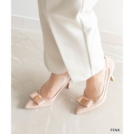 リボンにモノグラムパーツを施した上品なパンプス。