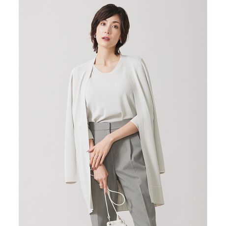 ■デザインストンと真っすぐにおちた衿ラインが上品な印象のシンプルなカーディガン。ボタンレスでミニマムなデザインは、どんなアイテムとも好相性でさらっとイージーに羽織っていただけます。柔らかな肌触りの中に適度なハリコシを持たせたコンパクトな目面で編まれているので、ボディーラインをすっきりとキレイに見せてくれます。今シーズンは袖口と裾リブ上に細めの配色ラインを入れてアップデート。軽さもありながらしわにもなりにくいのも嬉しいポイントです。普段使いからお出かけまで、幅広いシーンで活躍すること間違いなしの万能カーディガンです。※袖口と裾リブ上の配色ラインは、トープ(042)・サックスブルー(073)はオフホワイト、ブラック(005)はネイビーとなっております。
