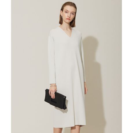■デザインゆったりシルエットがエレガントで美しい佇まいの、ハイゲージのVネックワンピース。ストレッチ糸を一緒に編み込むことで透けが気にならない肉感で、適度な落ち感も生まれ洗練された高級感ある仕上がりになっています。袖周りはコンパクトなサイジングになっているので、リラクシーな抜け感のあるシルエットながらきちんと見えも叶えてくれます。今シーズンは鎖骨映えするシャープ目なVネックラインの端目に、細い配色ラインを効かせてポイントに。中心を敢えて一目乗せリンキングをすることで縦ラインも強調され、華奢見えも叶う秀逸な逸品です。※ネックの配色ラインは、トープ(042)はオフホワイト、ブラック(005)はネイビーとなっております。