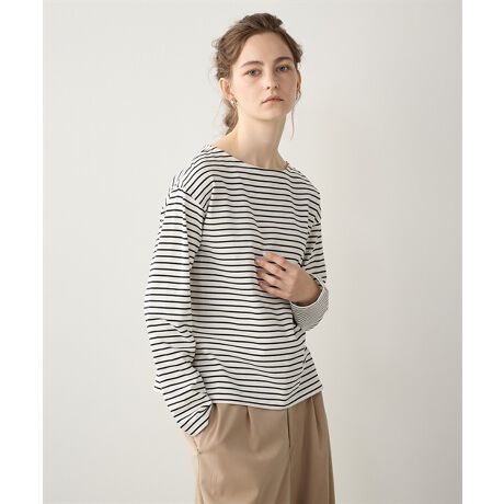 首回りをすっきりと見せるボートネックのボーダープルオーバー。やや肩を落としたドロップショルダーで、シルエットに抜け感も加えています。トレンド問わず着用できる、ベーシックなデザインのアイテムです。