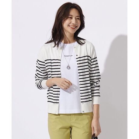 ボーダー柄が上品な存在感を放つ、軽く爽やかな着心地のクルーネックカーディガン