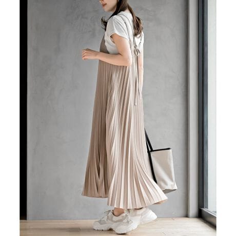 動きのあるプリーツが女性らしい印象を与えるジャンスカワンピース。