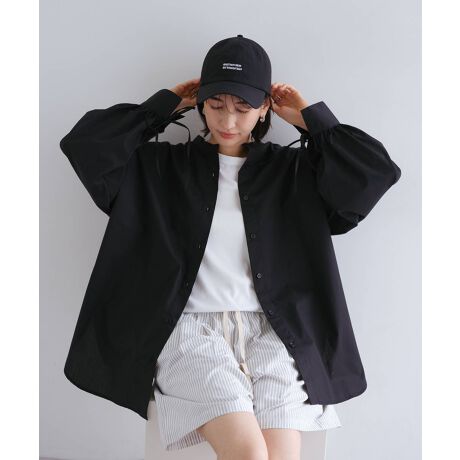 無地/ストライプ 袖リボン バンドカラー 長袖 シャツ ブラウス
