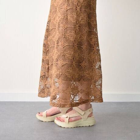 厚底でも計算されたトゥスプリング(つま先の床面からの距離)で足の自然なローリング歩行をサポートするオリジナルソールのサンダル。