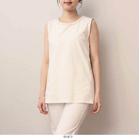 衿ぐりのラメテープがキラッとアクセントになるシンプルなタンクトップです。