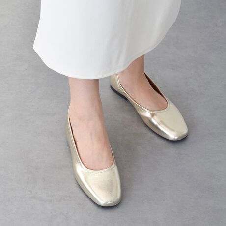 メタリックレザーのラウンドトウバレエシューズはベーシックなデザインで長くお使い頂けます。