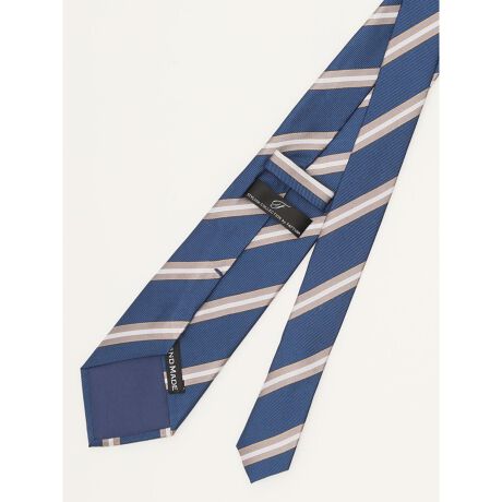 太い線と細い線がリズミカルに並ぶ、ビンテージ調のシックシン・ストライプ柄です。紺経てを使用することで柔らかな陰影があります。素材感のあるネイビーやグレー系のジャケットと相性抜群。オンスタイルはもちろんプライベートのタイドアップスタイルにも大活躍してくれます。