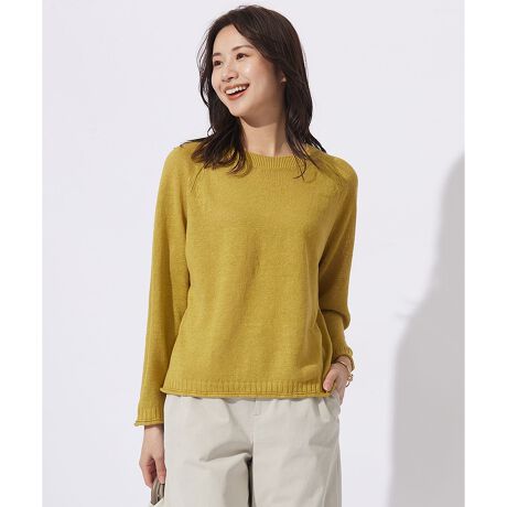 リネンの風合いを生かした、シンプルでさらっと着こなせる9分袖のニット。袖口や裾は締め付けない仕様で、ナチュラルでフラットなシルエットがポイントです。エポーレットスリーブ(肩の上部が肩章のようにつながった形)のデザインで、リラックスして着こなせる大人のカジュアルアイテム。顔まわりをすっきりと見せるクルーネックは、ネックレスなどのアクセサリーとも相性抜群です。飽きのこないデザインで、スカートにもパンツにも合わせやすく、デイリーに活躍します。カラーは、女性らしい華やかなピンク(#012)、柔らかな色味のベージュ(#033)、コーデのアクセントになるパイングリーン(#064)、洗練された印象のダルブルー(#074)の4色です。