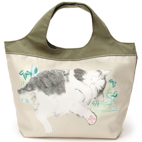 布バッグは軽いので使い勝手が良いです。トートバッグかミニサイズか迷いましたがミニで充分そうです。淡い優しい色遣いのユニークな猫の二十?面相笑えます。