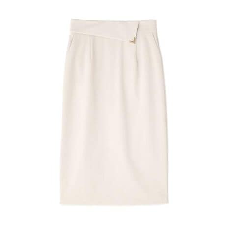 中肉の2WAYストレッチ素材で仕立てたタイトスカート。ウエストにメタルパーツが付いた綺麗なシルエットのタイトスカートです。ベルト端のL字メタルパーツのきれいめエレガンスなディテールが目を引きます。ウエストの高い位置にポイントを集めることで、スタイルアップ効果抜群のスカートに仕上げました。