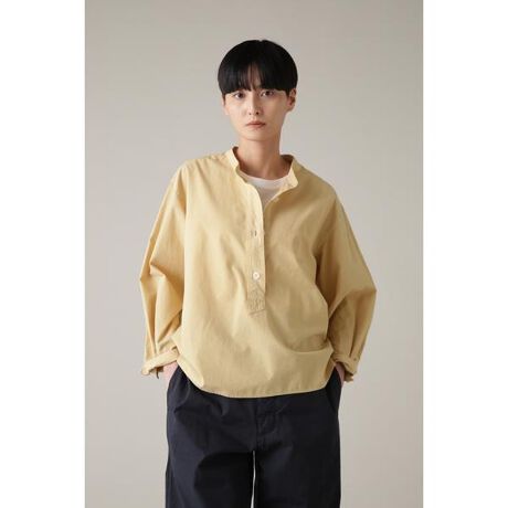 オーガニックテキスタイル認証の世界基準であるGOTS認証がされたコットンを使用したシャツ。国内の伝統ある織物産地で高密度に織り上げたこだわりの素材。自然なしわ感と洗いざらしの風合いが特徴で、深みのあるカラーリングもポイント。スタイルは、MHL.のアイコンとも言えるスウィングシャツで、脇の三角マチと前後差のある着丈が特徴的なデザイン。リラックスしたフィットと前立て下側の斜めのカッティングがキャラクターをプラス。