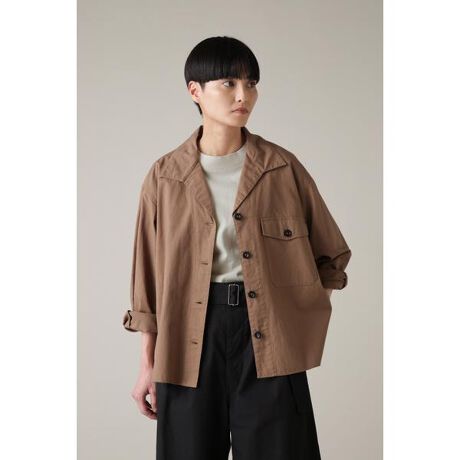タテ糸にコットン、ヨコ糸にコットンラミーリネンの混紡糸を使用した素材のシャツ。タンブラー仕上げを施すことで、ドライタッチな風合いの中に柔らかさを持ち合わせた素材。古い映画のワンシーンからインスパイアされたゆったりとしたラインの開襟シャツ。大きな襟と、胸のボタン付きのフラップポケットがアクセント。羽織りとしても着用しやすく、バックヨークはインタック仕様で動きやすい設計。