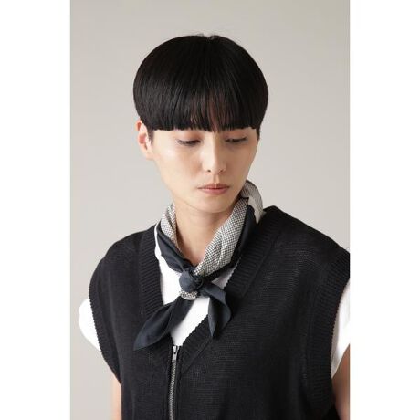 一枚ずつ職人の手で丁寧にプリントされたコットン素材のスカーフ。細かなチェックを中央に配し、そのまわりを囲むようなパターンは、ハンドプリントの非常に高い技術を要するデザイン。チェックの部分は直線ではなく、あえて太さに差を出し全体的なバランスを考慮したアイテム。