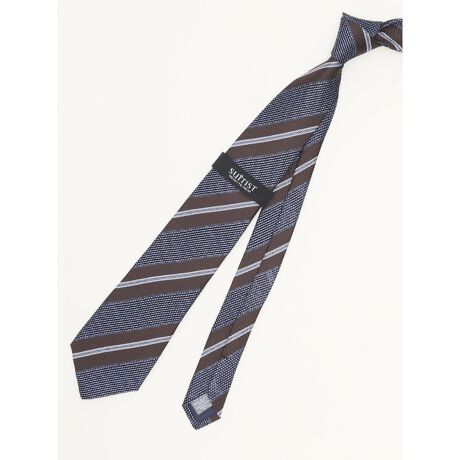 春夏のビジネスシーンにふさわしい、ストライプ柄のフレスコタイです。フレスコ織りのざっくりとした編地が、Vゾーンに奥行きとこなれ感を与えてくれます。普通のネクタイに飽きた方や、こだわりある一本をお探しの方におすすめです。