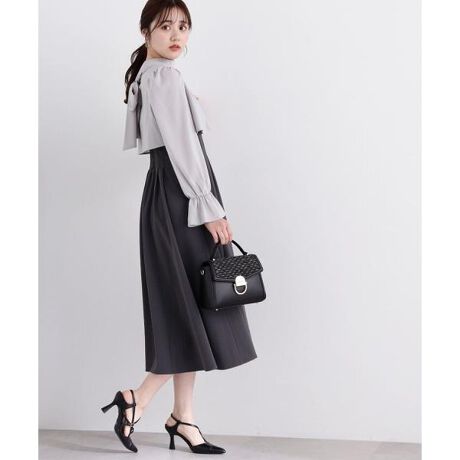 【商品特徴】ショート丈のブラウスをワンピースの上から着るアウトスタイルのSETUP。ブラウスは前後2Wayでも着用でき、ボウタイリボンは釦できちんと固定しつつ取り外しも可能。リボンタイは襟ぐり前のスリット開き位置でリボン結びをするのがおすすめ。袖はキャンディスリーブで、袖をたくし上げて腕まくりをすれば、袖丈の長さ調節ができます。単品使いもできるワンピースは、後ろウエストにゴムを入れた着心地が良いデザイン。【スタイリング】ブラウスをワンピースの上から着ると、上品なレイヤードスタイルが完成します。ワンピースは単体で使えるので、中にお手持ちのシアーインナーなどとレイヤードするとスタイリングの幅が広がります。