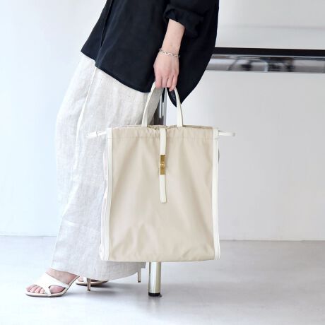 トレンドの金具デザインと入り口を絞ってクシュっとしても、絞らずそのままでも使用できる2wayデザインが特徴のナイロントートバック。