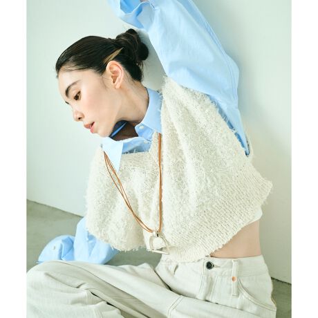 すっきりとしたVネックや、大き過ぎず程よくリラックスしたサイズ感がフェミニンに着用できるニットジレ。大きめに開いたアームホールによりレイヤードしやすく抜け感のある着こなしが叶う1枚。