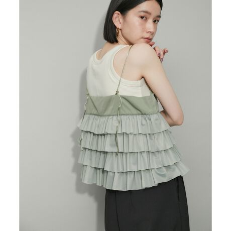 軽やかなティアードが映えるキャミソール。艶感のある素材でモードに大人っぽいデザイン。華奢な肩紐や素材コンビなど、細かい部分にもこだわった1枚。