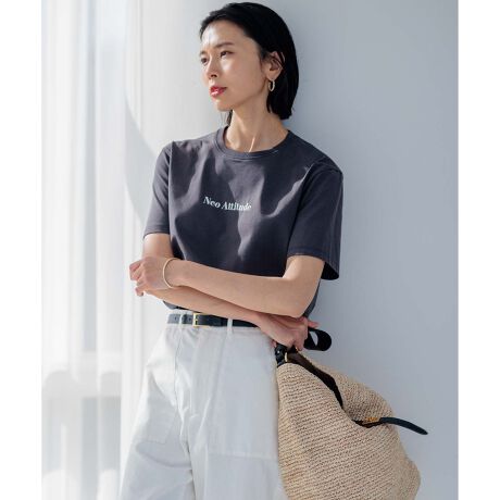 刺繍で描かれた文字が大人っぽいロゴTシャツです。身頃はベーシックな半袖Tシャツに、やや光沢のある糸で配色に刺繍することで、カジュアルになりすぎない上品な印象を出しています。カラーは合わせやすいホワイト(#001)、肌なじみの良い薄めのベージュ(#033)、シックなグレー(#004)、目を引くスモーキーグリーン(#063)の4色展開です。