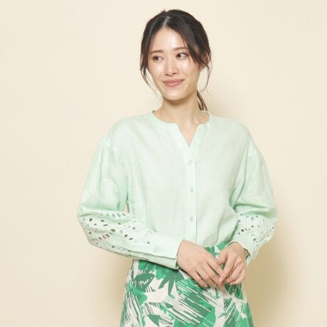 清涼感ある麻素材に、華やかなフラワーレース刺繍を施した大人フェミニンなブラウス。
