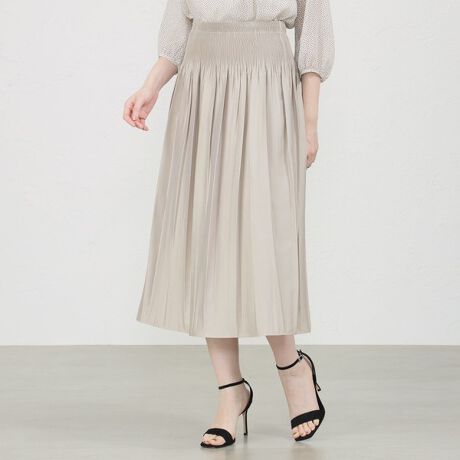 ジャカードでシャーリングを表現したスカートです。伸縮性がありウエスト周りをすっきりと見せてくれるので、トップスを重ねてももたつくことなく綺麗に着ていただけます。ウエスト内側のゴムは高級感のあるサテンを使用しています。