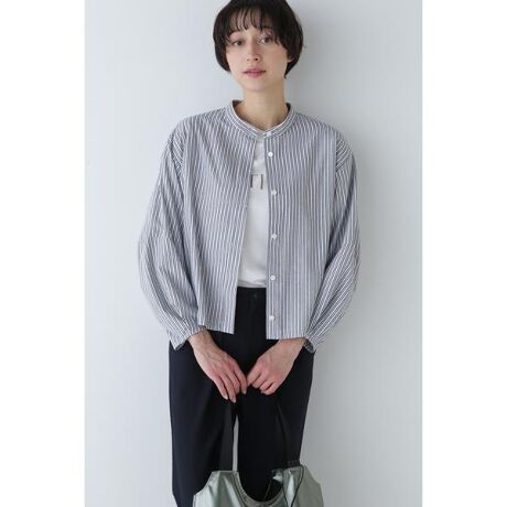 シンプルなバンドカラーシャツをトレンド感のある短丈に仕上げました。袖を切り替えとタックでフォルムを出し、ボリュームを持たせています。袖口の開きはないのでラフにロールアップしていただくデザインです。