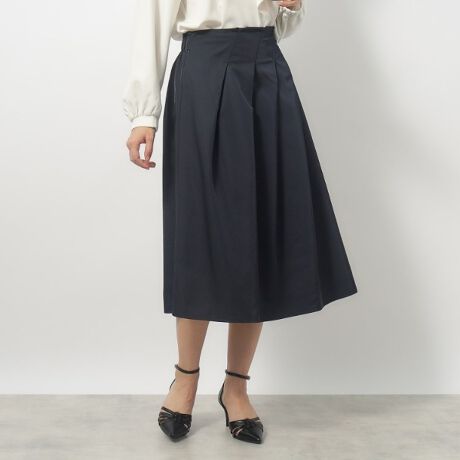 ・素材感を生かしたアシメタックが新鮮なフレアスカート。