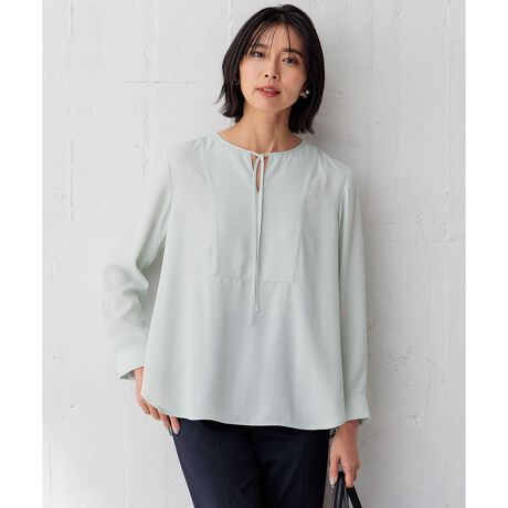襟ぐりについた細めのリボンが華やかさを演出。ジャケットなどを羽織ってもシンプルになりすぎずに着用して頂けます。身頃や袖部分はフラットに仕上げることでスタイリングを選ばず、どんなアイテムとも合わせやすい1着。クリーンなホワイト(#001)、柔らかい印象のスモーキーーグリーン(#063)シックなネイビー(#075)の3色展開です。