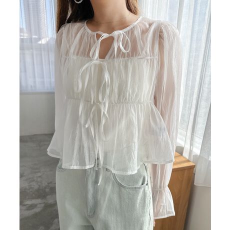 リボンや、身頃のシャーリング、袖口のフレアディテールなど、